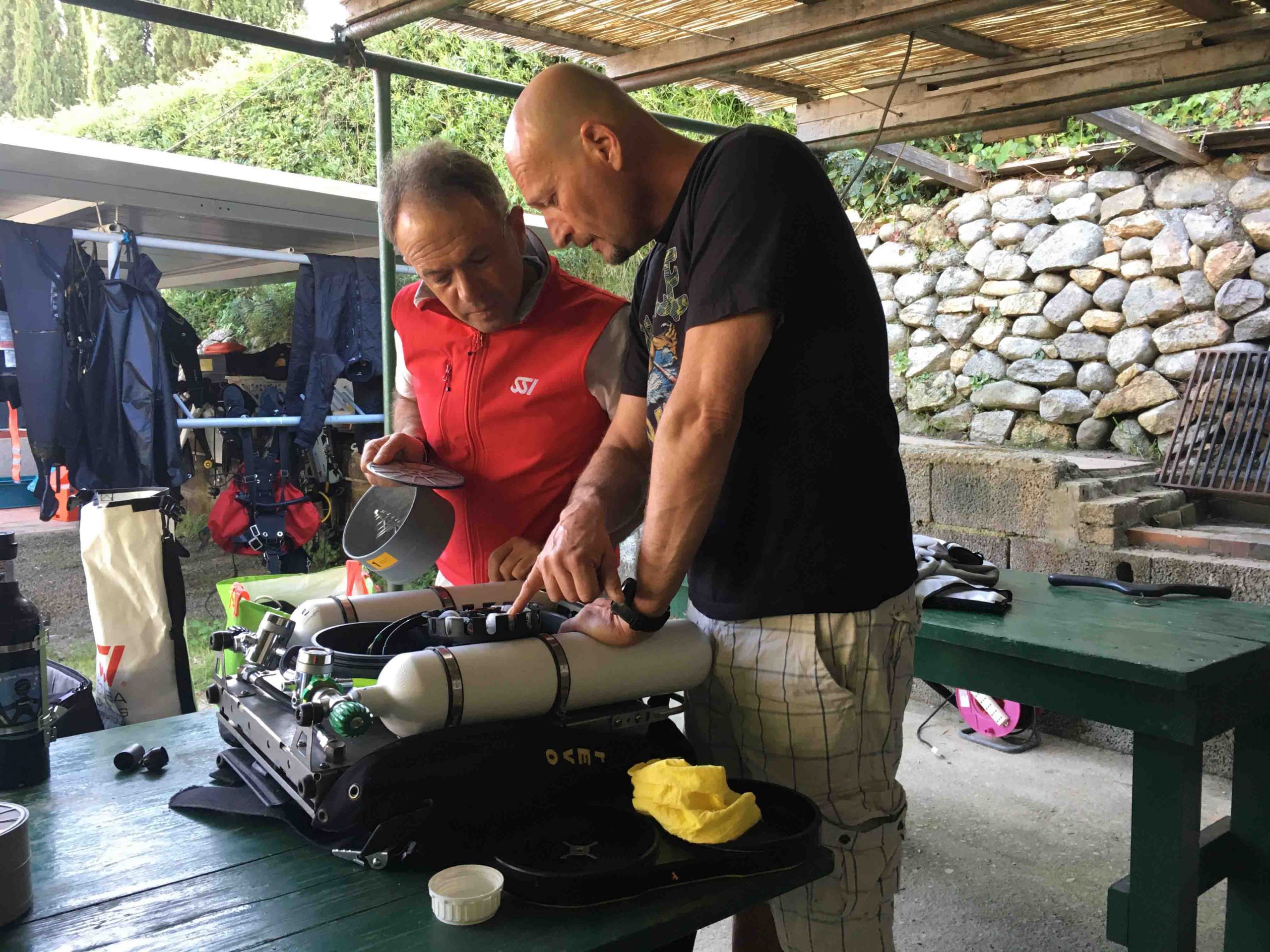 Ma in questi giorni il mio vero interesse è stato quello di iniziare ad entrare dal vivo nel mondo, per il momento ancora quasi sconosciuto, del circuito chiuso. Ho finalmente osservato da vicino la preparazione delle macchine ascoltando attentamente i preziosi insegnamenti degli istruttori presenti provando per la prima volta tutti i passaggi necessari per poter effettuare un tuffo in totale sicurezza.